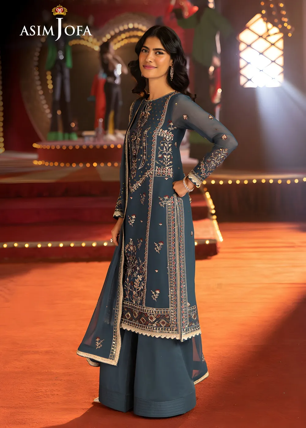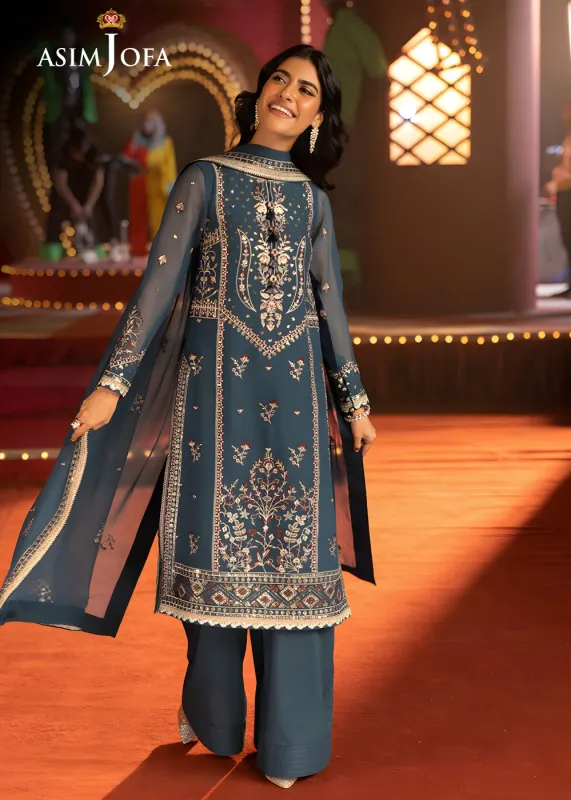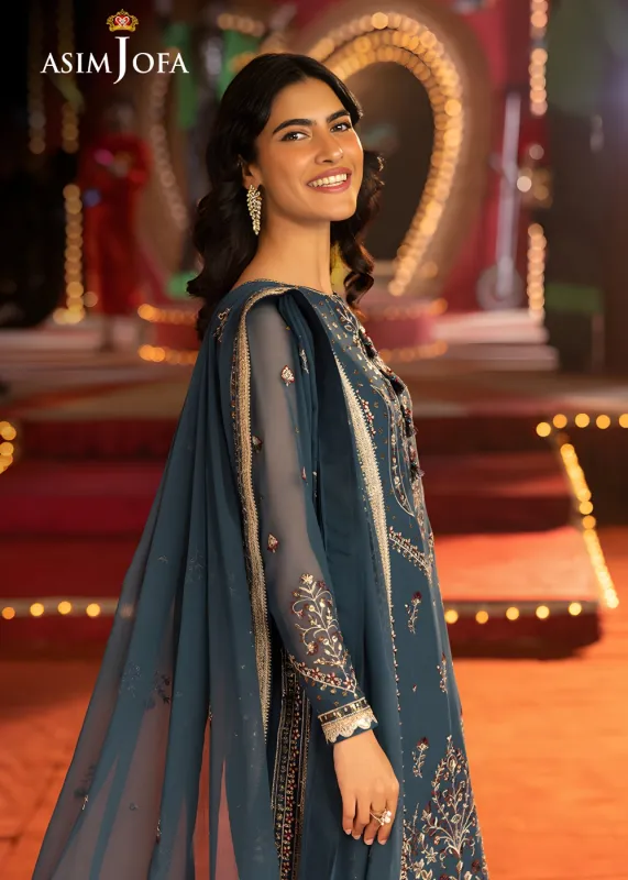 Radiating a serene charm, this turquoise blue ensemble is a graceful celebration of floral beauty. The shirt is adorned with intricate floral elements, embroidered in antique gold zari and light gold sequins that add a gentle luminosity to the fabric. Maroon and turquoise threads weave through the design, creating a rich contrast that breathes depth and vibrancy into each motif. Paired with a minimally embroidered dupatta, where delicate floral motifs are artfully scattered across the fabric, this look is effortlessly elegant—perfect for occasions that call for refined sophistication with a hint of festivity.